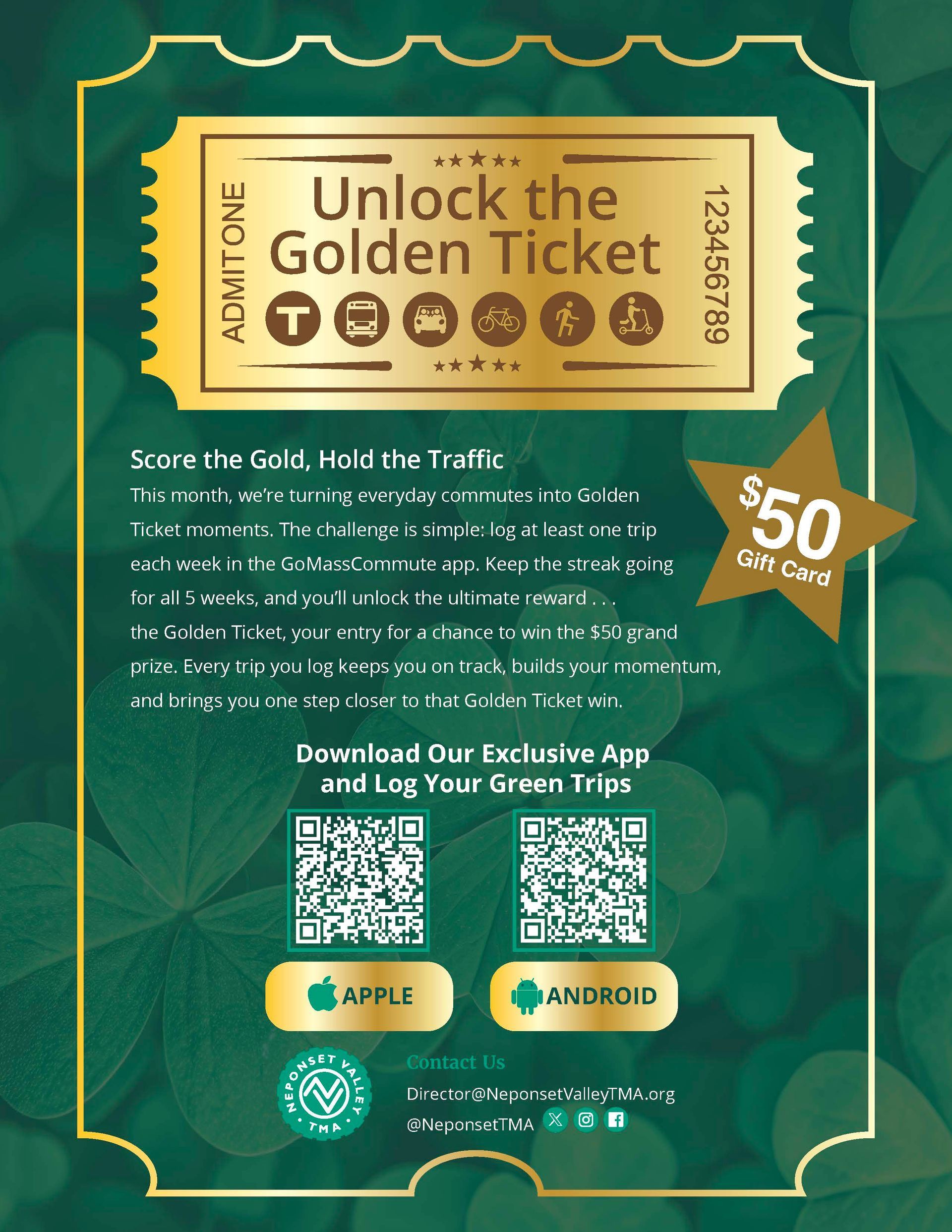 This month, we’re turning everyday commutes into Golden Ticket moments. The challenge is simple: log at least one trip each week in the GoMassCommute app. Keep the streak going for all 5 weeks, and you’ll unlock the ultimate reward . . . the Golden Ticket, your entry for a chance to win the $50 grand prize. Every trip you log keeps you on track, builds your momentum, and brings you one step closer to that Golden Ticket win.