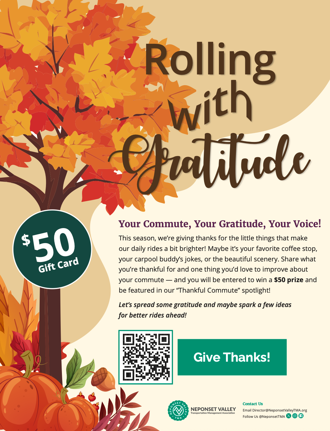 This season, we’re giving thanks for the little things that make our daily rides a bit brighter! Maybe it’s your favorite coffee stop, your carpool buddy’s jokes, or the beautiful scenery. Share what you’re thankful for and one thing you’d love to improve about your commute — and you will be entered to win a $50 prize and be featured in our “Thankful Commute” spotlight!